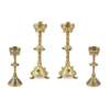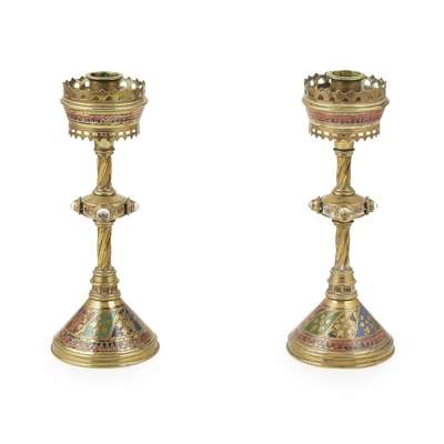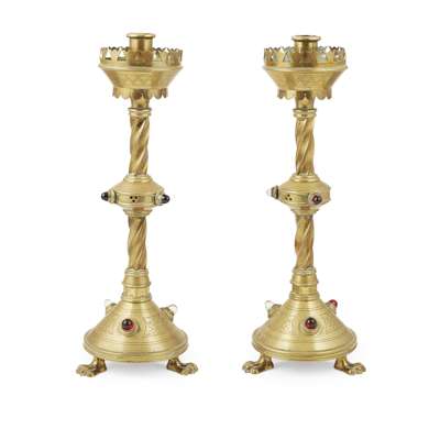 TWO PAIRS OF GOTHIC REVIVAL JEWELLED BRASS CANDLESTICKS, CIRCA 1880