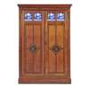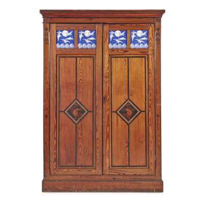 the moulded corners above two panelled doors, each inlaid with Minton tiles of flying cranes, above panels decorated with field mice and enclosing a fitted interior