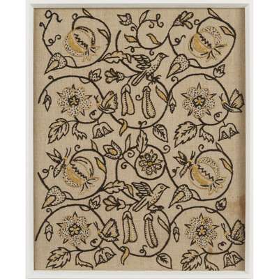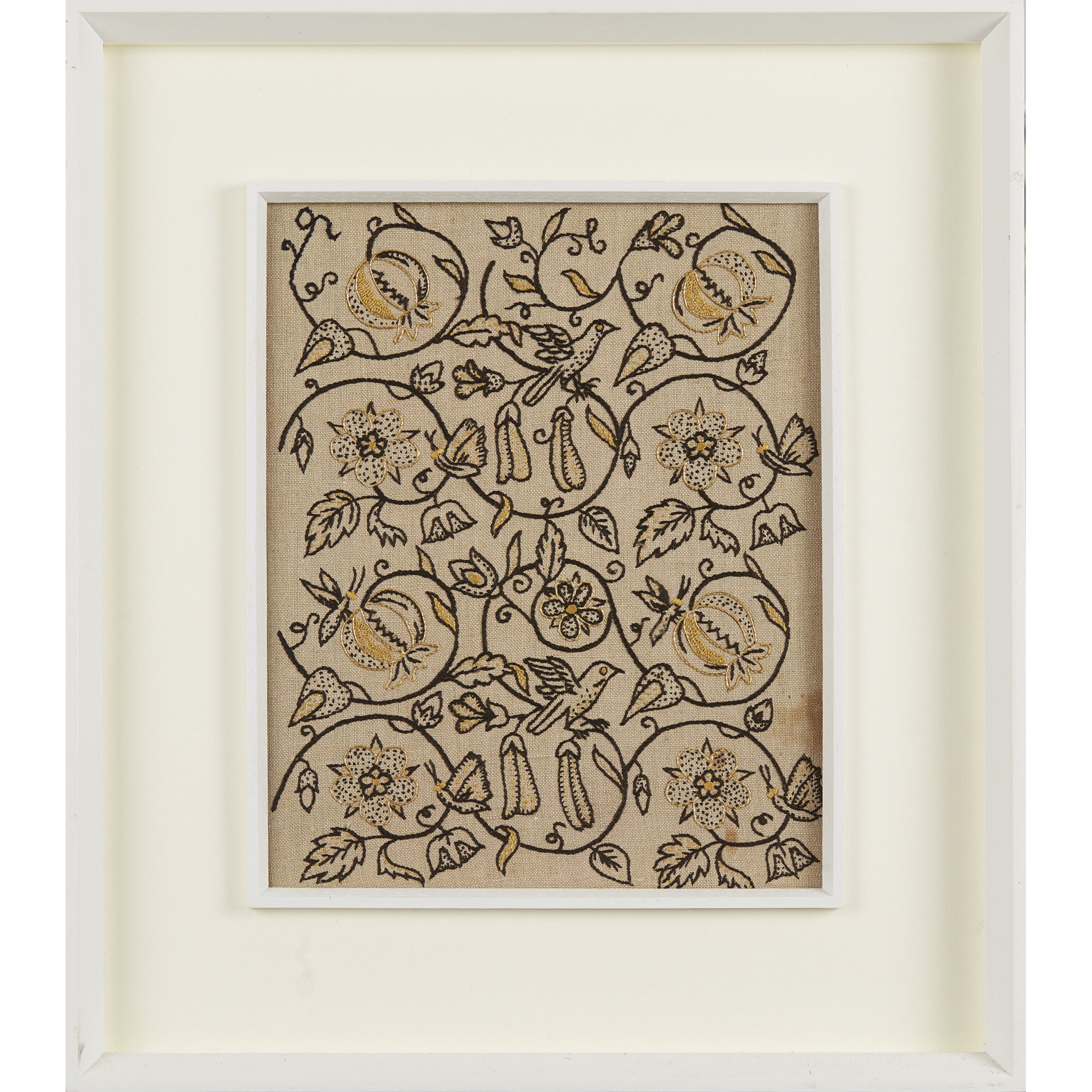 worked in coloured wools and metal threads with a bird and pomegranate design, reserved on a linen ground, framed