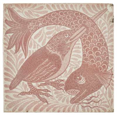'KINGFISHER SPEARING FISH' RUBY LUSTRE TILE, CIRCA 1890