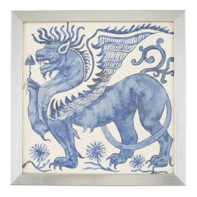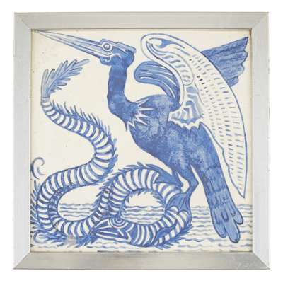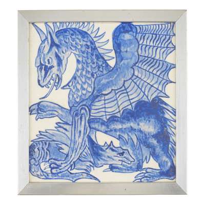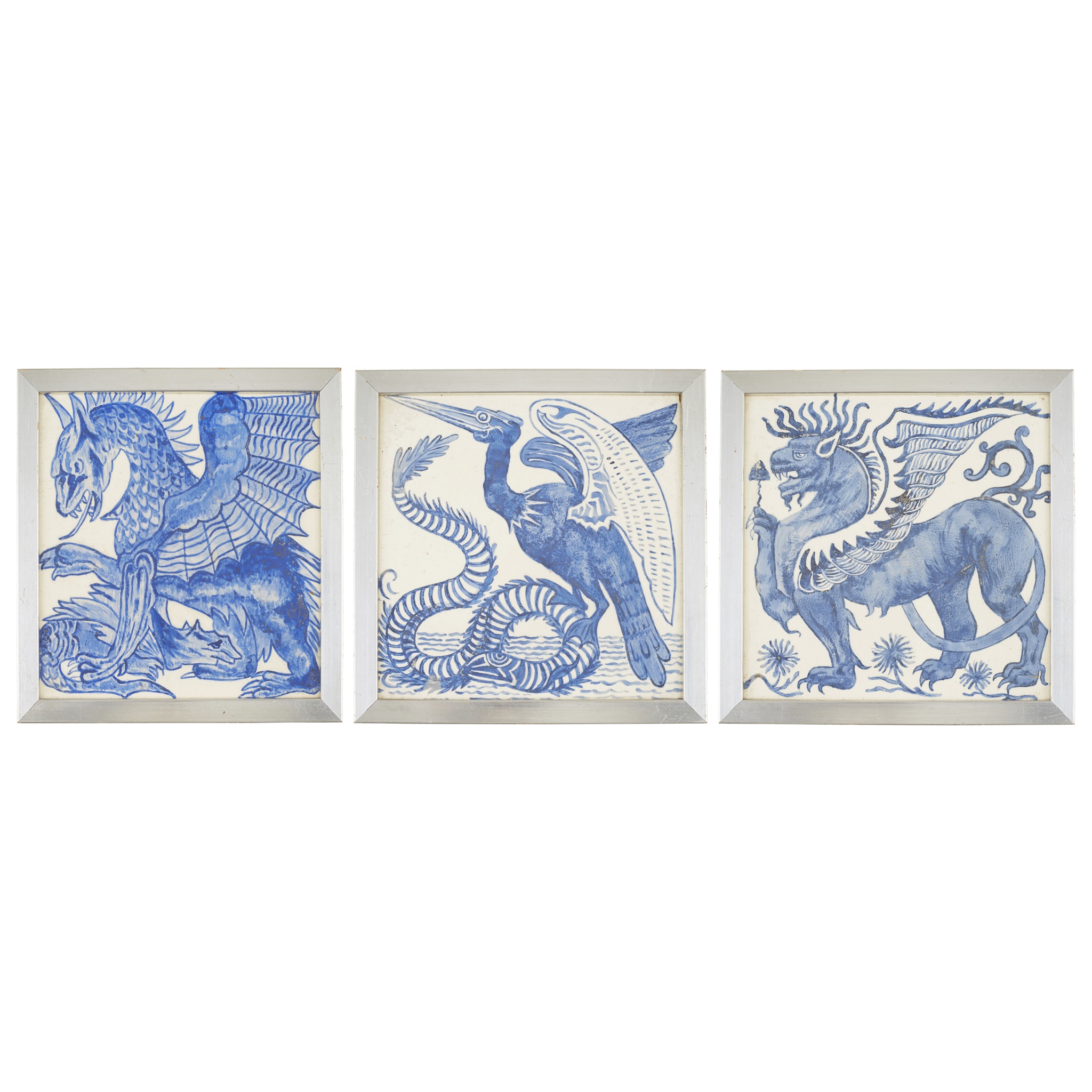 painted with a Dragon and its Young; Bird with Serpent; and Griffin, each painted blue on a glazed Minton blank, later framed