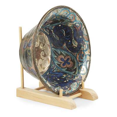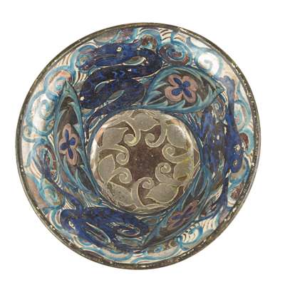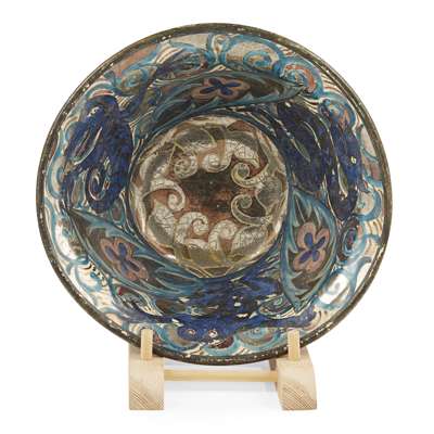 the interior painted with a bird, monkey and snake amongst stylised foliage in blue, green and metallic paint, the exterior painted with a frieze of foliate motifs, bears artist's monogram