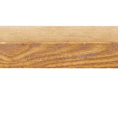 the rectangular moulded top above two drawers, each with drop handles forming the letter M, raised on four octagonal section supports with overlapping leaves, on trestle ends carved with the letter M and linked by a stretcher, stamped maker's mark to drawer HOLLAND & SONS