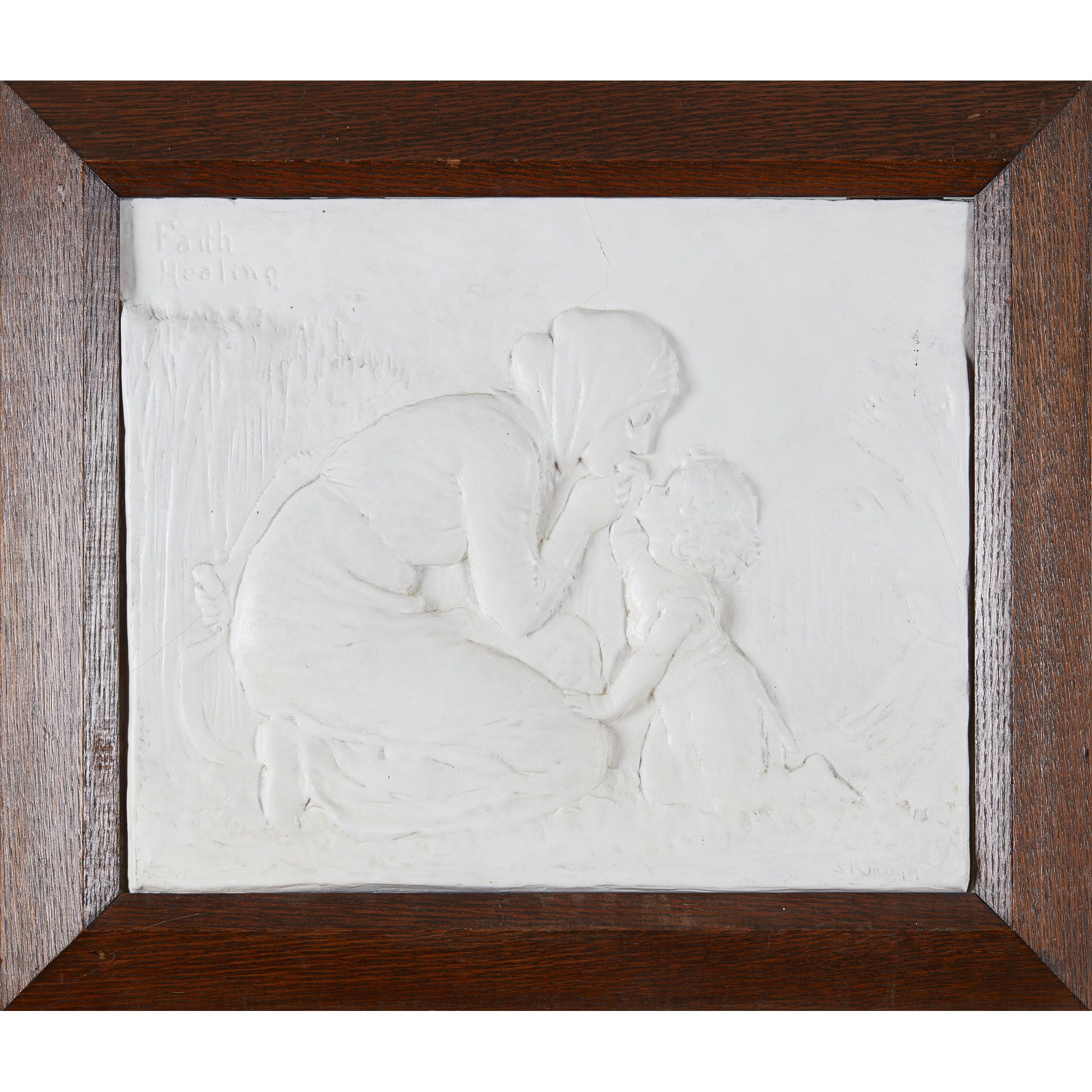plaster plaque moulded in relief, incised artist signature S R PRAEGER, inscribed FAITH HEALING, framed