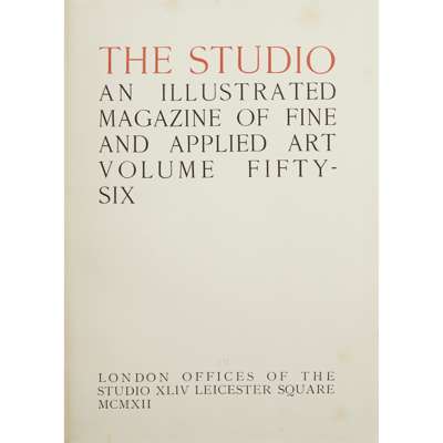 comprising sixteen single volumes, hardback; vols. 14,17,20,22,24,25,28,30 (2),33,38,40,46,49,51,56 ; Ten double volumes, hardback; vols. 14-15,16-17,20-21,22-23,24-25,26-27,34-35,36-37,82-83,86-87; thirteen individual nos., softback, nos. 78,299,332,372,379,380,383,399,402,405,412,475,512, with further nos. 227 and 228 printed in French; also in hardback; The Studio; Jan.-June 1900, vols. 19-20, nos. 82-87, with Special Winter Number, The Studio; vol. 24, nos. 103-106, The Studio; vol. XXVI, nos. 111-114, The Studio; 1902, nos. 106,108,109,110,112,115, The Studio; vol. 33, vols. 33-34, nos. 140-146, The Studio, nos. 91,98,108,110,112,117,118, The Studio, vol. 86, no. 366 (bound later as a hardback) and The Studio Yearbook of Decorative Art, 1922; together with Masters of English Landscape Painting by Holme, Charles (edit.), 1903, The Connoisseur, vols. 11,13,32,36 and 37, the latter with EXTRA CHRISTMAS NUMBER, and Onze Kunst, two vols. for latter halves of 1903 and 1904