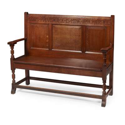 the panelled back carved to the top rail with inscription GOD'S PROVIDENCE IS MINE INHERITANCE, above open arms and solid seat on turned and blocked legs linked by stretchers