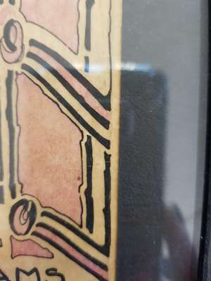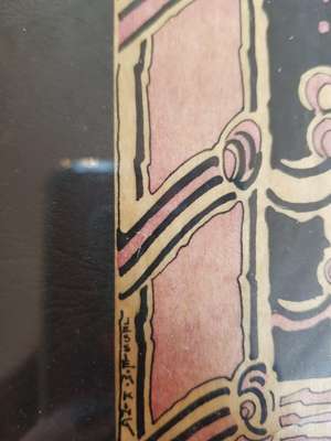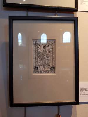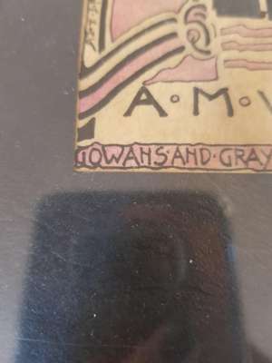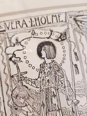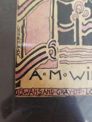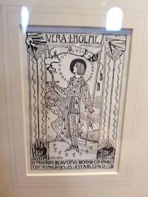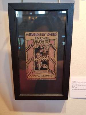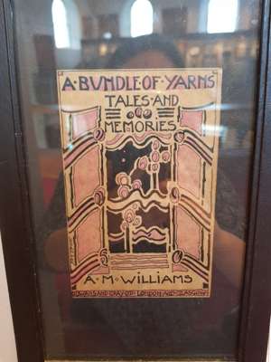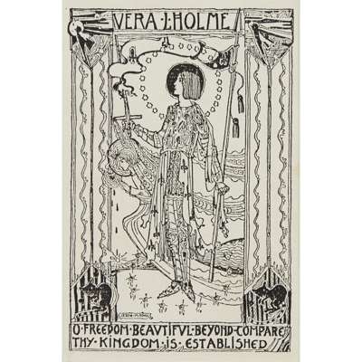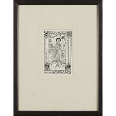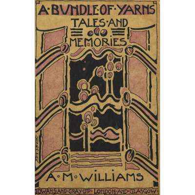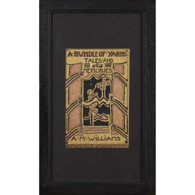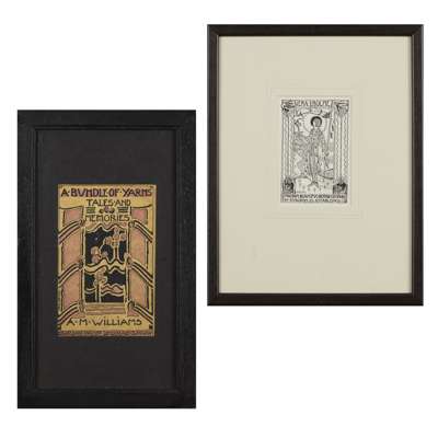pen and ink, bearing inscription A BUNDLE OF YARNS/ TALES AND/ MEMORIES/ A. M. WILLIAMS/ GOWANS AND GREY LTD/ LONDON AND GLASGOW, bears artist's signature lower left, framed, 14.5cm x 9.5cm; and a BOOKPLATE FOR VERA L. HOLME, print, bears inscription VERA L. HOLME/ O FREEDOM BEAUTIFUL BEYOND COMPARE/ THY KINGDOM IS ESTABLISHED/ JESSIE M. KING, framed, 12cm x 8cm