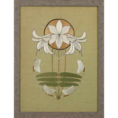 worked as a stylised lilies design reserved by a green linen ground, framed