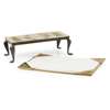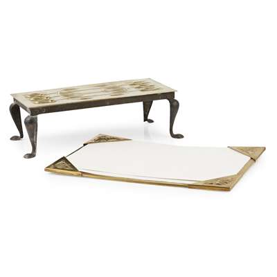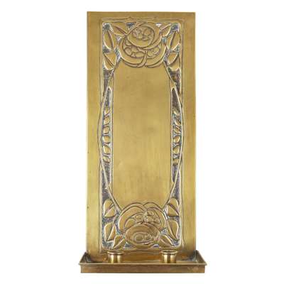 the rectangular top with repoussé-decorated stylised plant forms, raised on curved supports, 41cm wide; a BRASS BLOTTER, the corners repoussé-decorated with butterflies, 30cm x 45cm; together with a GLASGOW SCHOOL BRASS WALL SCONCE, CIRCA 1910, the rectangular back plate embossed with stylised roses, above a galleried drip tray with twin nozzles, 20cm wide, 46cm high