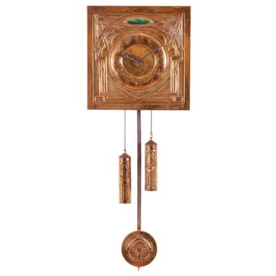with repoussé Celtic entrelac design with inset enamelled panel, includes decorated weights and pendulum, stamped monogram mark MG