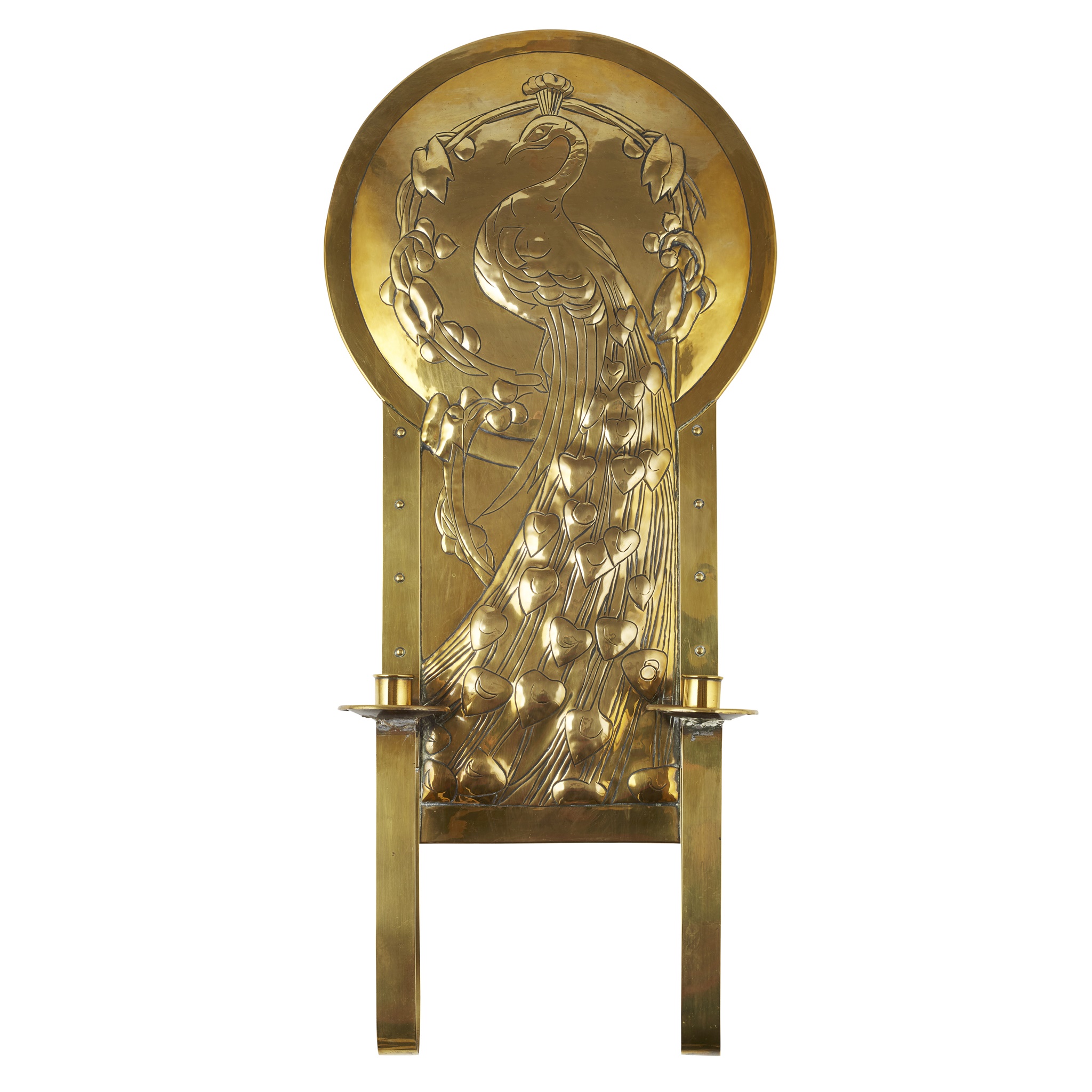 repoussé decorated with a peacock amongst stylised foliage, with twin applied candle arms