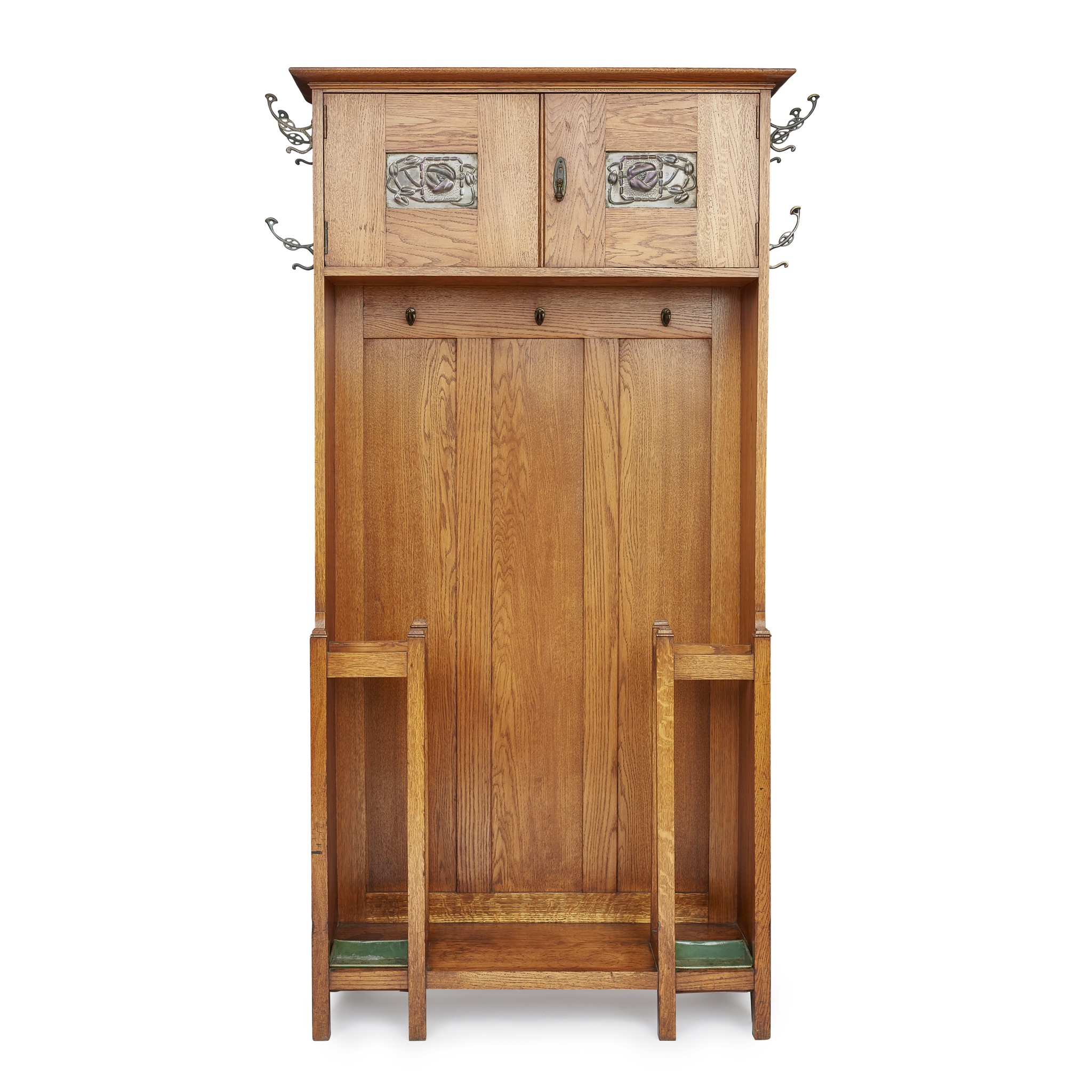 the projecting cornice above two panelled doors, inset with embossed metal panel, above an open interior with coat hooks and sectioned umbrella stands, the whole raised on square feet