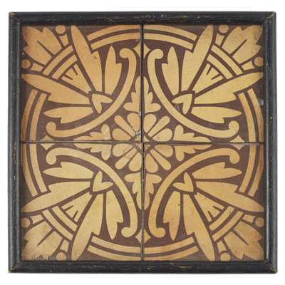 each of shaped oval form with stylised foliate decoration, 22cm long; together with a FRAMED GOTHIC REVIVAL ENCAUSTIC TILE PANEL, comprising four tiles, decorated with a stylised foliate pattern, within an ebonised frame, each tile 10.3cm square approx.