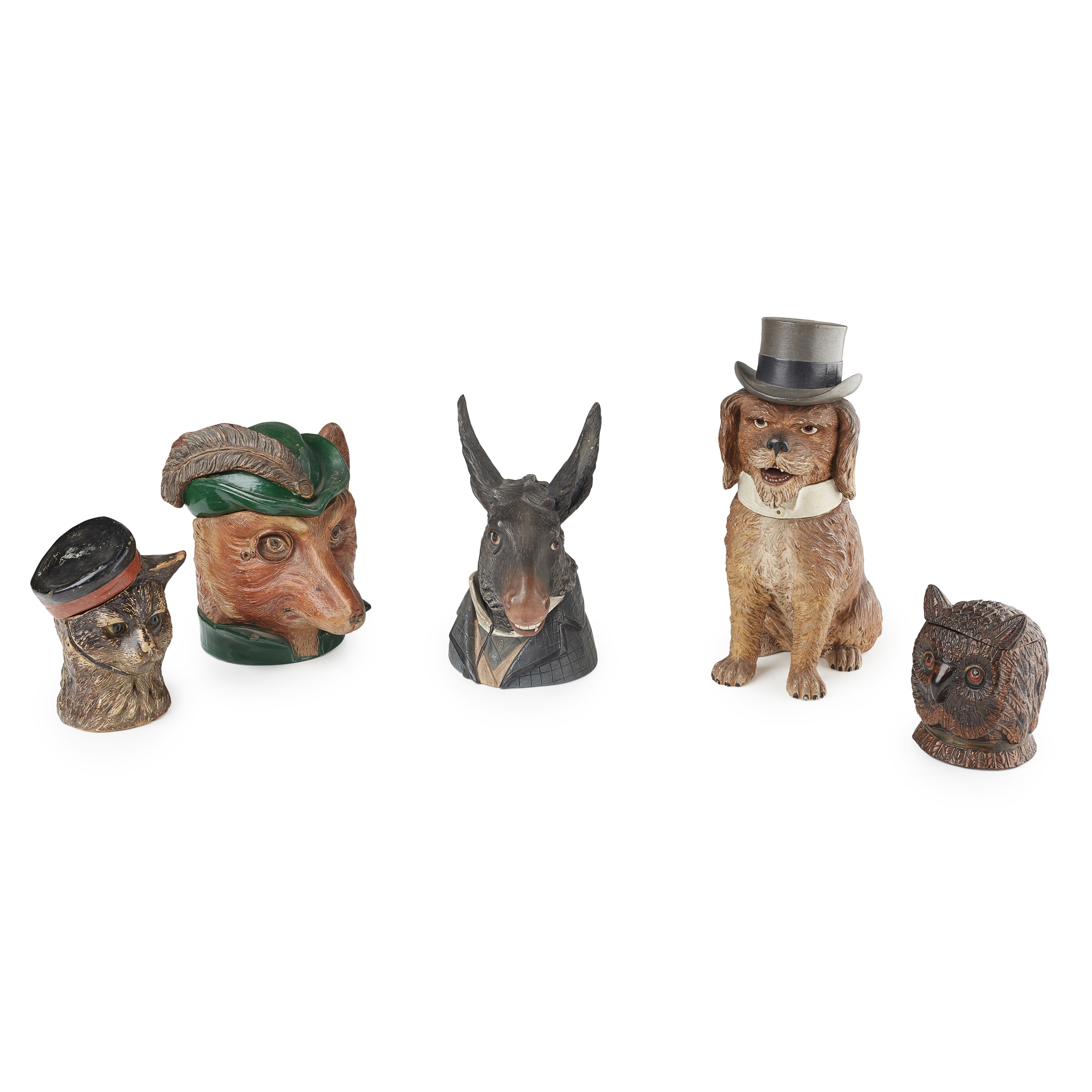 all of animal form, comprising two by Bernhard Bloch, one a CAT wearing an official’s cap, with impressed marks ‘BB / Austria / 8001’, 15.5cm high; the other a DOG in a top hat, with impressed marks ‘BB / 8136’, 31.5cm high; together with a jar modelled as DONKEY with a monocle, with impressed marks ‘385’, 23.5cm high; a FOX as Robin Hood, with impressed marks ‘1309’, 22cm high; and an OWL, with impressed marks ‘HB / 326’, 13cm high