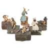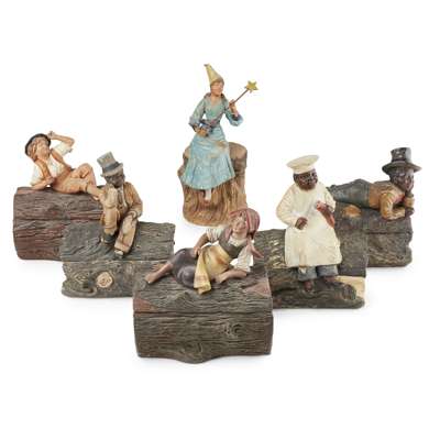 all modelled as figures on tree stumps, comprising a FAIRY, unmarked, 28.5cm high; a BUTCHER, impressed marks 'JM/ 3498', 22cm high; a MAN with an umbrella, impressed marks 'JM/ 5458', 21.5cm high; a recumbent MAN in a top hat, impressed marks 'JM/ 3396', 20cm high; a BOY in a headdress, unmarked, 20cm high; and a GIRL, unmarked, 19cm high
