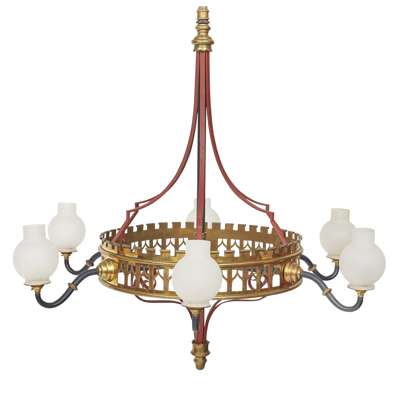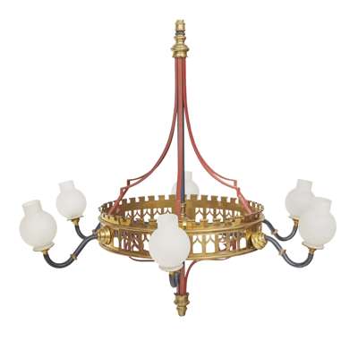 converted to electricity, with castellated pierced corona supporting six curved arms, each terminating in a light fitting with later opaque glass shades, centred by a turned central column with scrolling supports