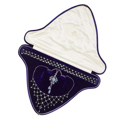 moonstone and enamel set, comprising a BRACELET, 31cm long; a MATCHING NECKLACE, 41cm long including chain; and a PENDANT, 9.5cm drop excluding chain, all within original velvet and silk-lined fitted box, with maker's mark MRS. NEWMAN/ GOLDSMITH & COURT JEWELLER/ 10 SAVILE ROW/ W., the lid with gilt tooled initials F.L.O.