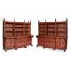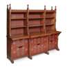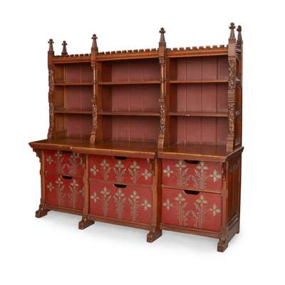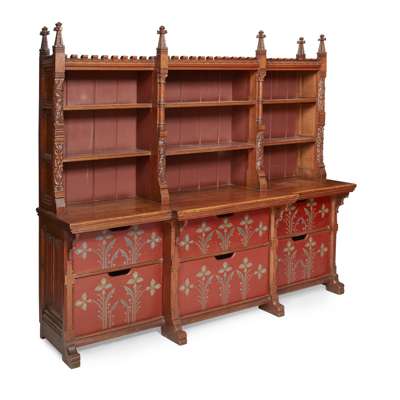 each with castellated cornices and leaf carved finials above an arrangement of open shelves, divided by columns carved with lilies and roses, the base with open shelves, and the sides having linen-fold panelling, the whole later fitted with painted sliding drawers