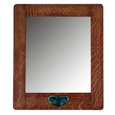 the rectangular oak frame with exposed dowel decoration set with a Ruskin panel and enclosing a later mirror plate, ivorine label verso LIBERTY/ LONDON