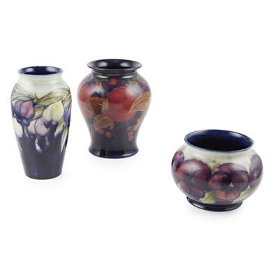 painted signature W. MOORCROFT, impressed maker’s marks MOORCROFT/ BURSLEM/ ENGLAND 17.5cm high; together with a ‘PANSIES’ POSY VASE, CIRCA 1915, painted signature W. MOORCROFT, impressed maker’s marks MOORCROFT/ BURSLEM, 10.5cm high; and a ‘PLUM WISTERIA’ SHOULDERED VASE, CIRCA 1918, painted signature W. MOORCROFT, impressed maker’s marks MOORCROFT/ BURSLEM/ ENGLAND, 18.5cm high
