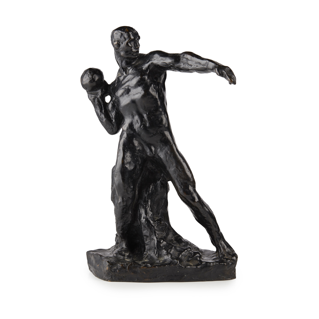 bronze, modelled as a male nude figure throwing a shot put, signed on base WELLS