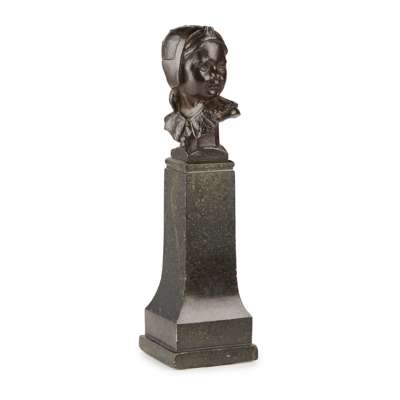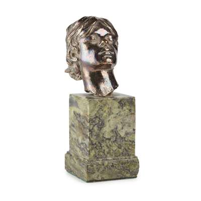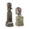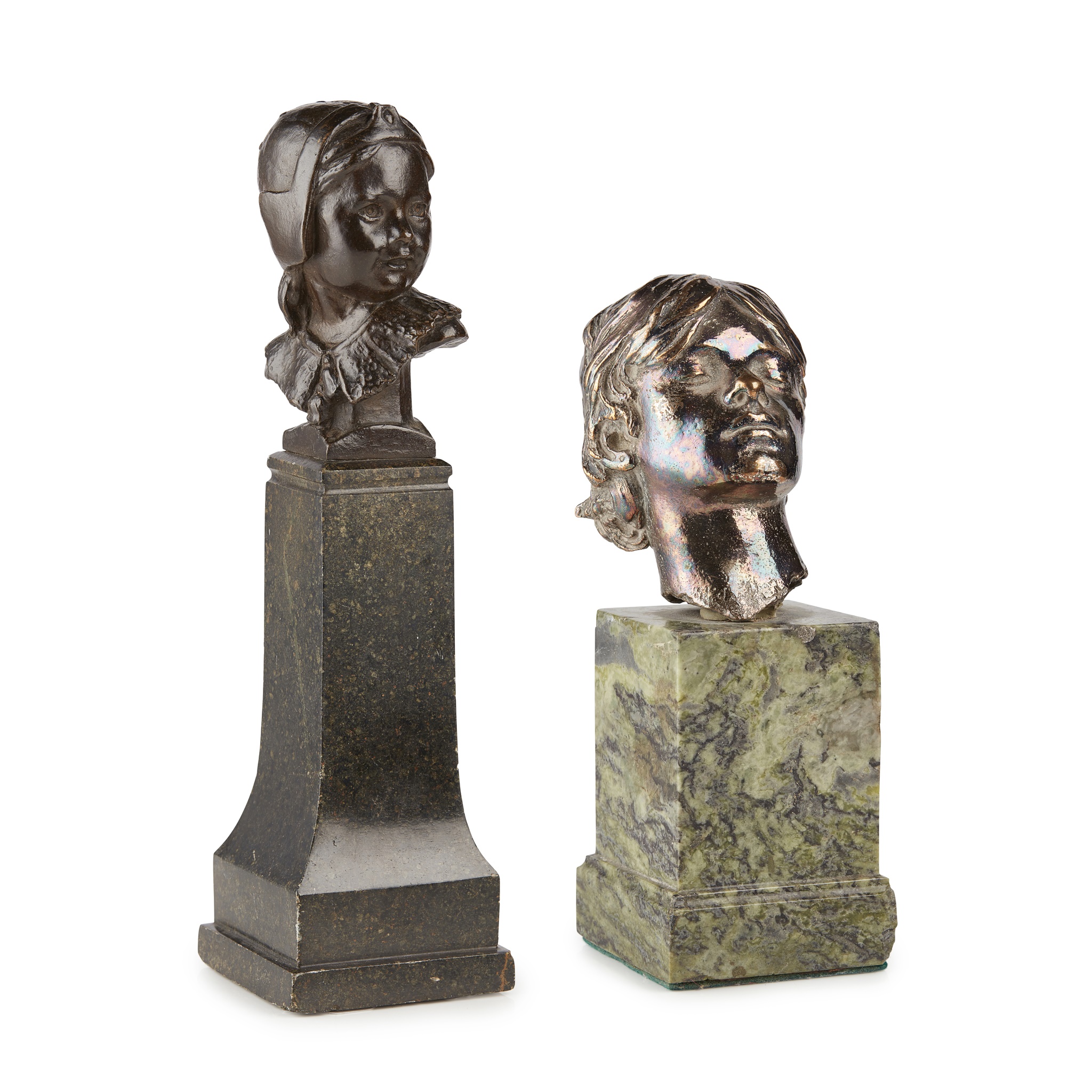 bronze, dark-brown patina, raised on a tapering marble plinth base, signed R.S, 28.5cm high overall, 11.5cm high (excluding base); together with ALFRED BERTRAM PEGRAM (1873-1941) HEAD OF A YOUNG BOY, silvered bronze, indistinctly signed A. BERTRAM PEGRAM, raised on a green marble plinth base, 21.5cm high overall, 11cm high (excluding base)