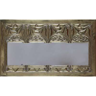 of rectangular outline, the mirrored plate enclosed by a brass frame, repoussé-decorated with stylised flora and wave pattern with entwined Celtic knotwork