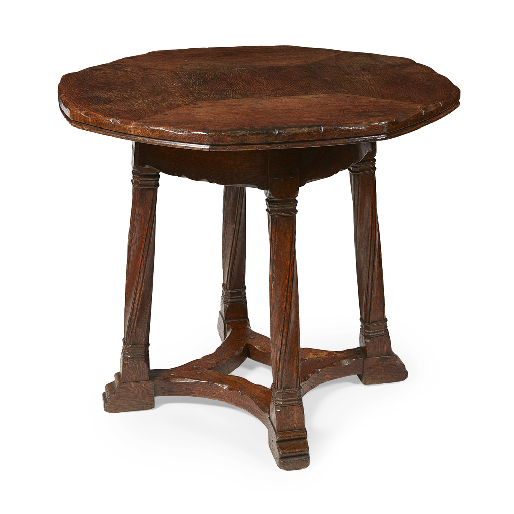 the octagonal sectional top with pegged construction, above chamfered frieze on spirally turned fluted and reeded supports with moulded collars, linked by curved and chamfered stretchers on moulded bracket supports