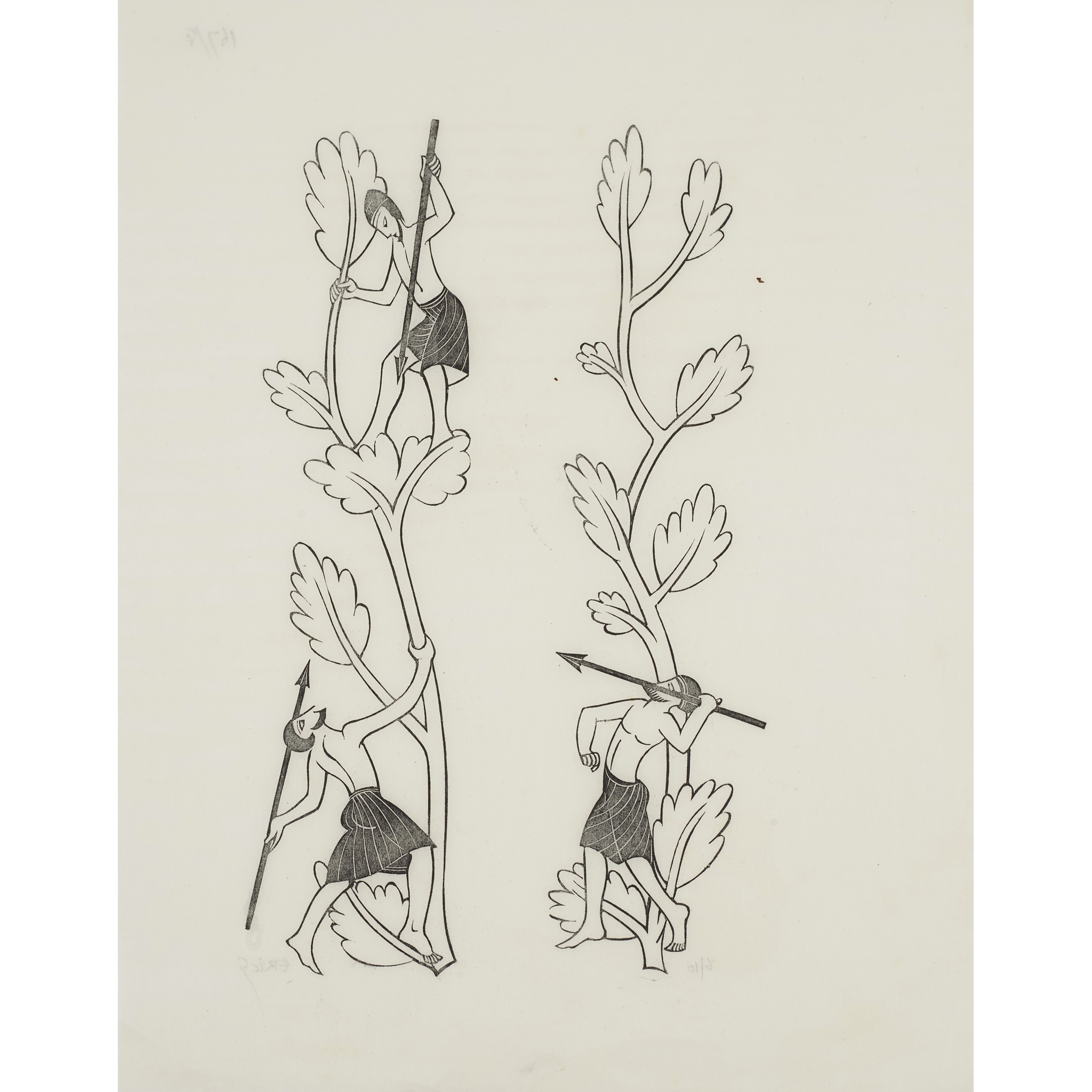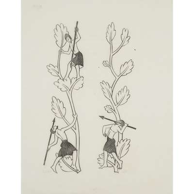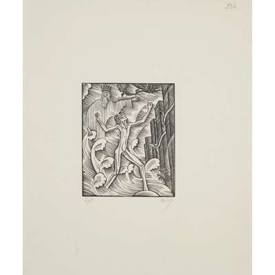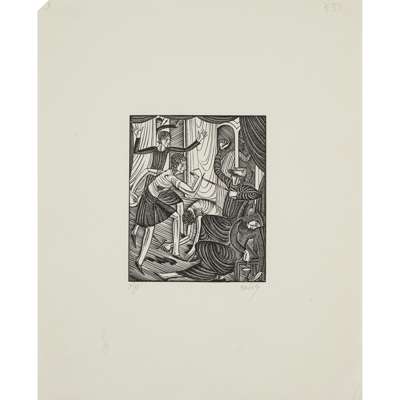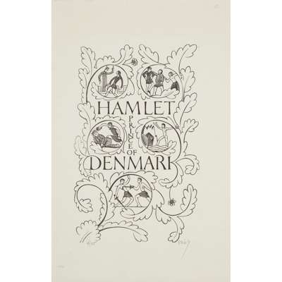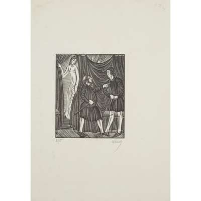 unframed woodcut, edition 4 of 25, signed lower right in pencil, 27cm x 17cm; and 'THE HISTORY OF KING HENRY VIII', 1937, unframed woodcut, edition 3 of 10, signed lower right in pencil, 38.5cm x 22.5cm; and 'MAN THROWING SPEAR. TWO MEN WITH SPEARS', unframed woodcut, edition 6 of 10, signed lower right in pencil, 23cm x 19cm; together with THREE FURTHER WOODCUT ILLUSTRATIONS, unframed, each depicting scenes from Shakespeare's 'Hamlet, Prince of Denmark', each signed lower right in pencil