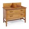 the rectangular top with leaf-carved edge and chamfered dividing upstand above two graduated drawers with characteristic bronze handles