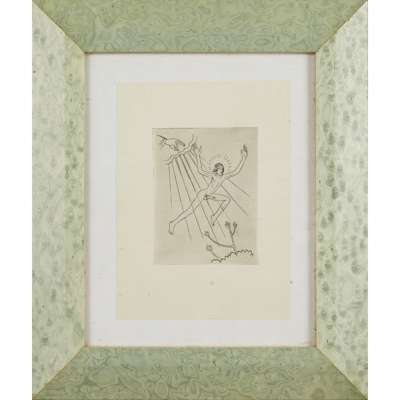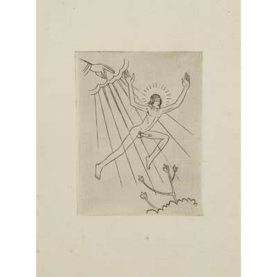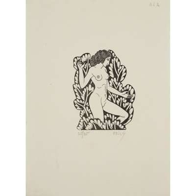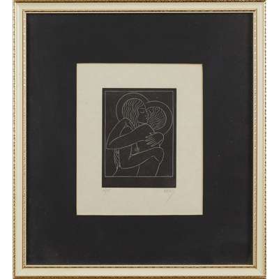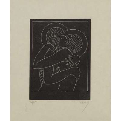 unframed woodcut, signed lower right in pencil, 9.5cm x 14cm; and 'DIVINE LOVERS: 1', woodcut, 10/25, signed lower right in pencil, framed, 16cm x 12.5cm; together with 'GOD SENDING' woodcut, unsigned, framed, 19cm x 14cm