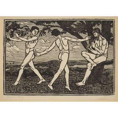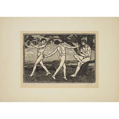 to include DANCING BOYS, signed and inscribed in pencil, 23.5cm x 32.5cm; HARVEST BY THE SEA, signed and inscribed in pencil, 10.5cm x 17cm; BOYS BATHING, signed and inscribed in pencil, 11cm x 16cm; BOLSHEVISTS AGENT, signed and inscribed in pencil, 16.5cm x 15.5cm; AUGUST, inscribed, 9cm x 12cm; and another in the same frame, signed in pencil, 9.5cm x 11.5cm