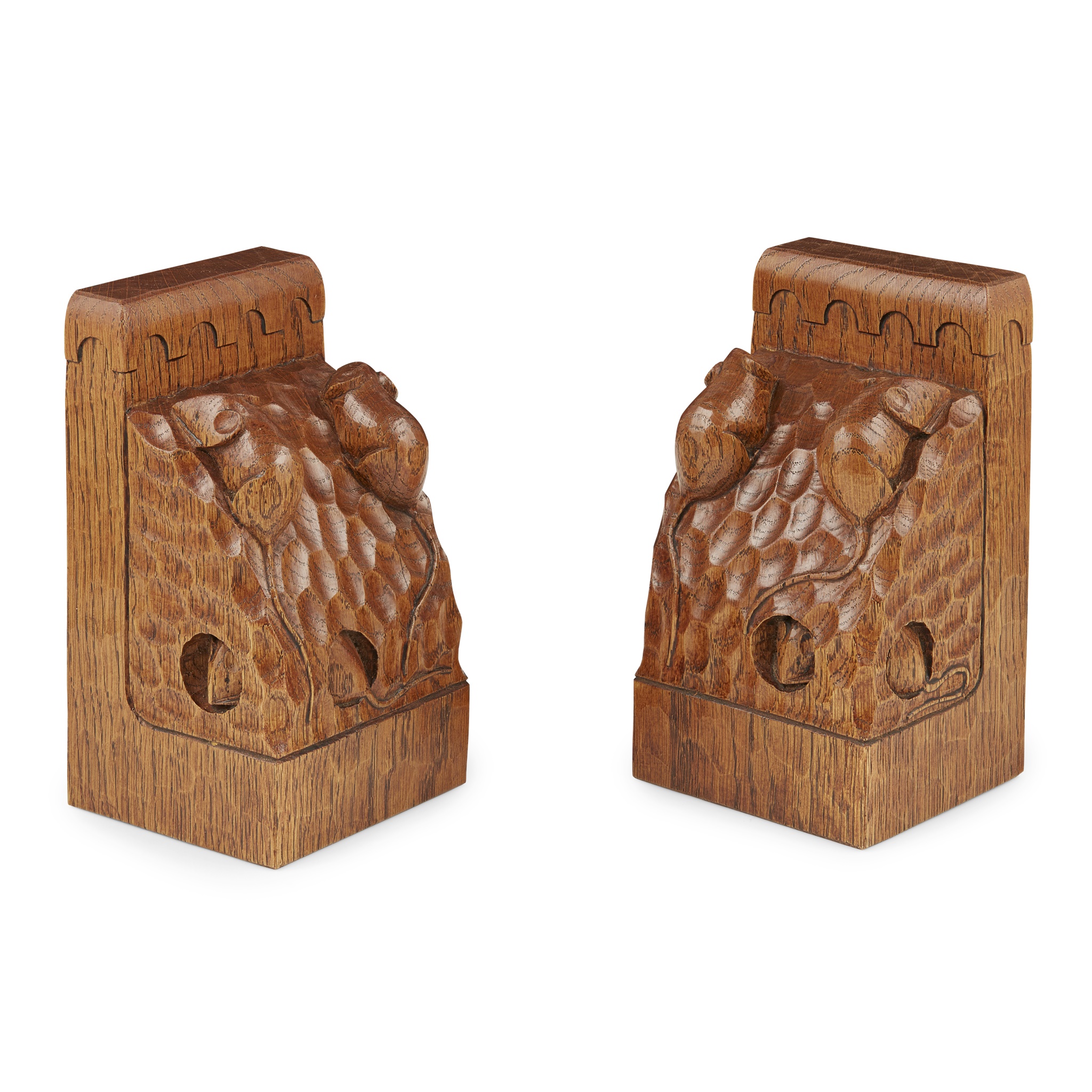 each carved with three mice, and with tooled finish