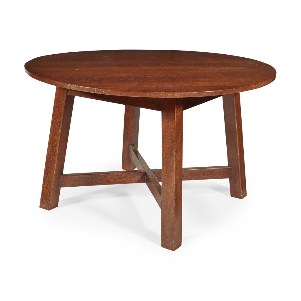 the circular quarter-sawn top, raised on square legs and linked by a cross stretcher, bears maker's label under top