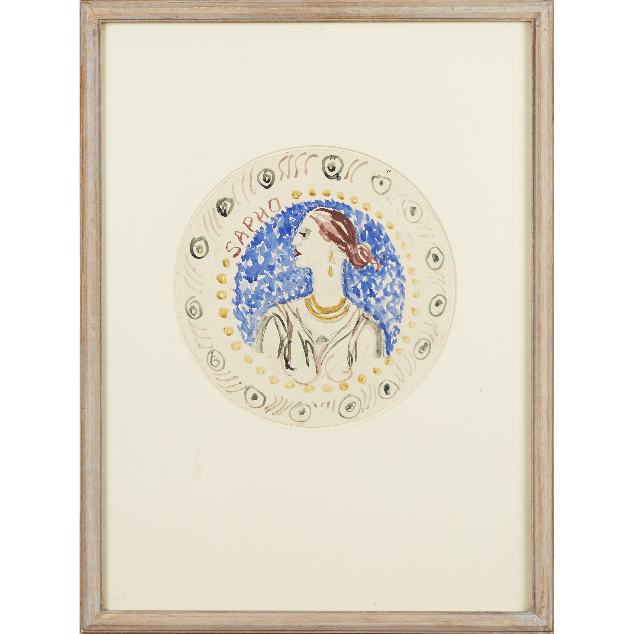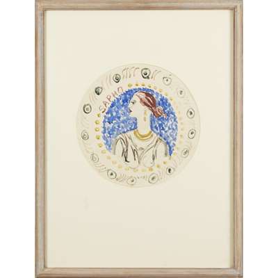 Note: The current lot is a design for a plate, which formed a large dinner service, commissioned from Vanessa Bell and Duncan Grant by Kenneth Clark, the late Lord Clark in 1932. The Famous Women Dinner Service was a 50-piece ceramic dish set featuring portraits of famous women from history, completed between 1932 and 1934. The subjects ranged from Hollywood star Greta Garbo to the Queen of Sheba to Marian Bergeron, who in 1933 became the youngest-ever Miss America at age 15.