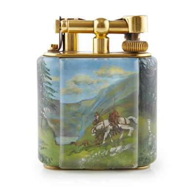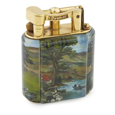 the lucite panels decorated with a hunting and fishing scene, cast maker's mark DUNHILL/ MADE IN ENGLAND/ PATENT NO 143752