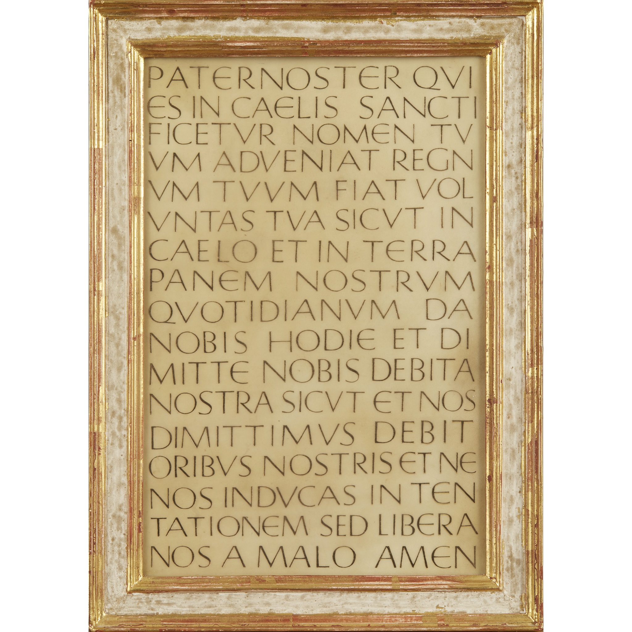 inscribed with the Lord's Prayer in Latin and tooled in gilt on vellum, framed