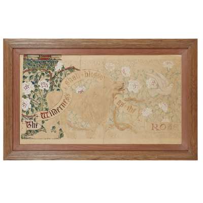 watercolour, pencil and bodycolour on paper, bearing the legend THE WILDERNESS SHALL BLOSSOM AS THE ROSE, indistinctly inscribed to the margin in ink, A L'ECHAULILLON EST? (F)INGLE C'DESSONS, within later oak frame