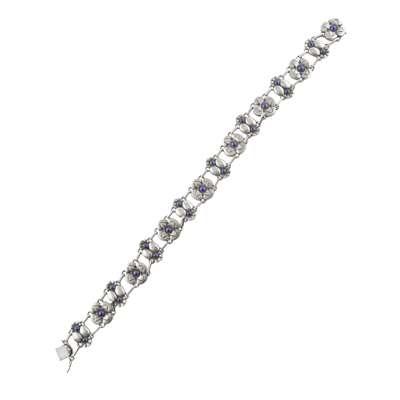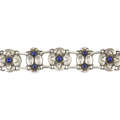 comprising sixteen foliate links set with twenty-four blue cabochons, with link spacers, stamped maker's marks GEORG JENSEN/ STERLING/ DENMARK/ 25