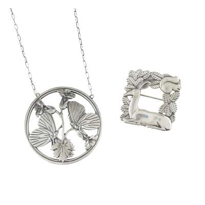 the circular pendant decorated with opposing butterflies, with fine link chain, stamped maker's marks GEORG JENSEN/ STERLING/ DENMARK 105, pendant 5.5cm diameter; and a GEORG JENSEN BROOCH, designed by Arno Malinowski, depicting a deer and squirrel amongst foliage, stamped maker's marks GEORG JENSEN/ STERLING/DENMARK/318, 4cm square