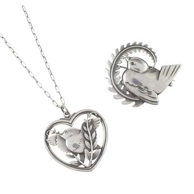 depicting a robin on a fern frond, stamped maker's marks GJ/ STERLING DENMARK/ 309, 5cm across; together with a STERLING SILVER PENDANT, in the form of a bird amongst fern fronds within a heart, with fine link chain, stamped maker's marks GJ/ 925/ STERLING DENMARK/ 97, pendant 4cm across