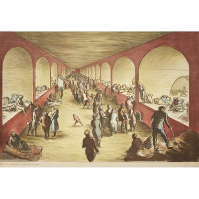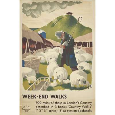 comprising 'UNDERGROUND TO BETHNAL GREEN' by Laurence Scarf, 101cm x 63cm; 'WEEKEND WALKS' by Clare Leighton, 102cm x 63.5cm; 'THE COUNTRY NOW' by Clare Leighton, 101cm x 63cm; together with 'SHELTER SCENE' by Edward Ardizzone, published by The Baynard Press for The National Gallery, 76cm x 101cm; 'CHINGFORD' by Tony Sarg, root number 35, printed by Johnson, Riddle & Co. Ltd, London, 75cm x 50.5cm; and 'CROCUS TIME' by Hawley Morgan, 75.5cm x 50.5cm