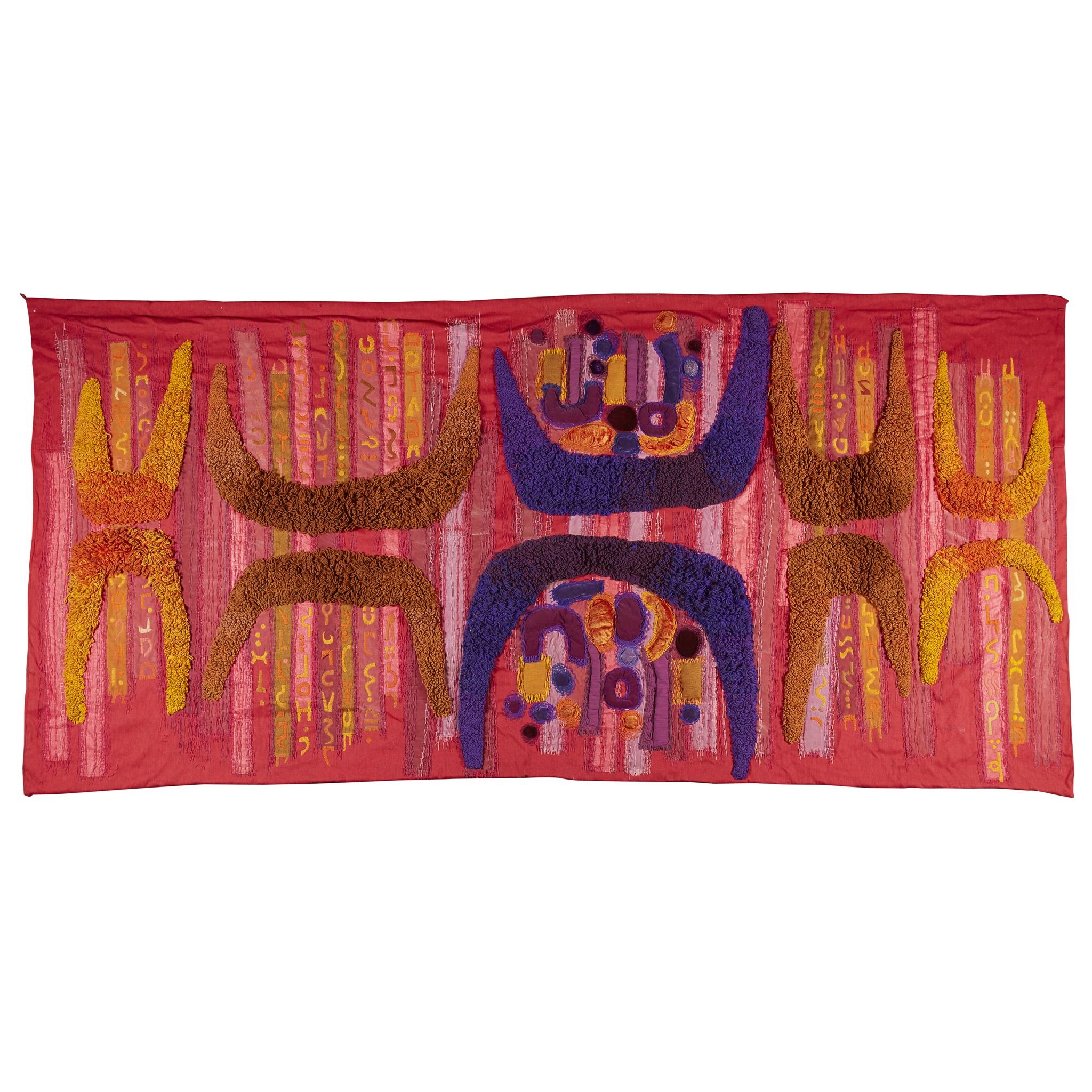 abstract forms in looped wools and mixed threads with appliqué work, reserved on a puce ground, signed SABISTON