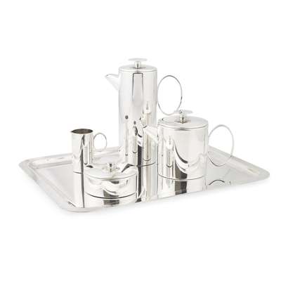 comprising a TEAPOT, 13.5cm high; a COFFEE POT, 22cm high; a MILK JUG, 8cm high; a SUGAR BOWL AND COVER, 10cm diameter; and a SERVING TRAY, 43cm across, each with stamped maker's marks