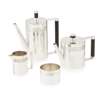 silver and hardwood, each of cylindrical form with ribbed decoration, comprising a COFFEE POT, 16cm high; a TEAPOT, 10cm high; a SUGAR BOWL, 4cm high; and a MILK JUG, 6cm high, stamped maker's mark A.E.J., hallmarked Birmingham 1995