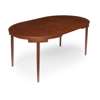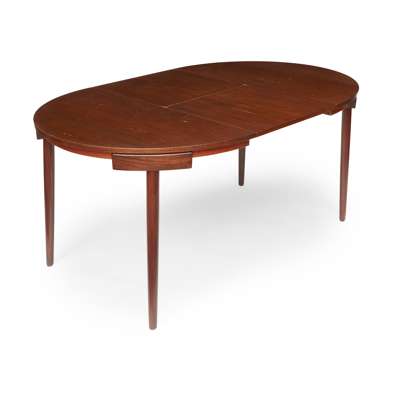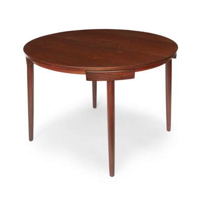 comprising an extending DINING TABLE with integral additional leaf, 105cm diameter (closed), 160cm long (extended), 73.5cm high; and SIX MATCHING CHAIRS, each with three legs and later fabric upholstery, 50cm wide, 70cm high, 42cm deep, bears branded maker's marks FREM RØJLE/ MADE IN DENMARK