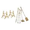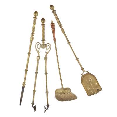 stamped maker's marks, 23cm high; and a SET OF THREE AESTHETIC MOVEMENT BRASS FIRE IRONS BY BENHAM & FROUD, CIRCA 1880, comprising a POKER, 76cm long; COAL TONGS, 74.5cm long; and an ASH SHOVEL, 76cm long; together with an ASSOCIATED BRUSH, 64 cm long, stamped maker's marks and date lozenge for October 1880