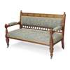 the back with spindle gallery and inlaid with panels of flowers, later upholstered with Morris and Co 'Bluebell' fabric, above open arms and close-nailed upholstered seat, raised on turned and blocked legs