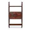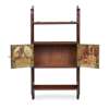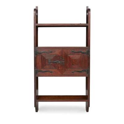 with open shelves above two panelled doors fitted with decorative latch and hinges and opening to reveal painted panels each depicting scenes from the Rubáiyát of Omar Khayyám, A BOOK OF VERSES UNDERNEATH THE BOUGH... and AS UNDERCOVER OF DEPARTING DAY..., signed and dated with initials MB 1919, with further open shelf below