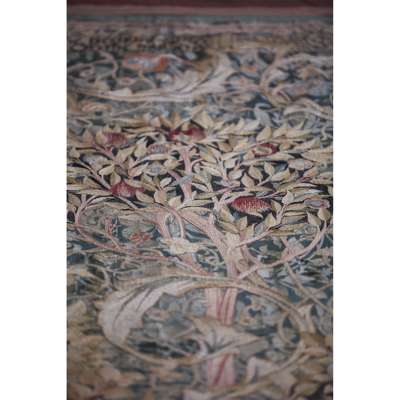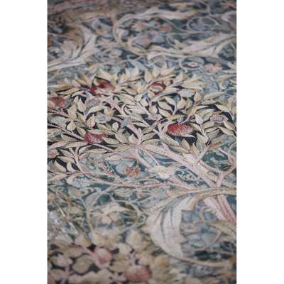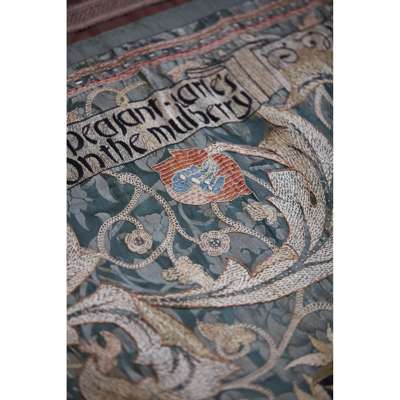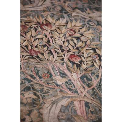 The composition shows a central tree, flanked by a colourful orchard of sinuous apple, pomegranate and cherry trees, The Fruit Garden successfully depicts naturalistic interlocking sprays of acanthus leaves and fruiting vines with delicacy, skill and creative invention. The inscription, an excerpt taken from her father’s poem The Flowering Orchard implies the portière was intended as a series, each with subtle differences in the composition and bearing another excerpt from the poem. Records from May’s inventory indicate that four separate orders were placed from 1892 to 1896 and a near identical and signed version of this portière exists in the collection of the Museum of Fine Arts in Boston. As strong coloured silks intertwine against a deep green damask ground, The Fruit Garden is a stunning visual delight, made to complement the simplicity and subtlety of Arts & Crafts furniture.
